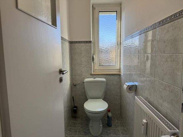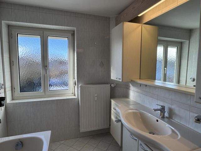 Das Tageslichtbad bietet sowohl eine Dusche als auch eine Badewanne sowie WC, Waschbecken und ein großes Fenster. Zusätzlich sind Anschlussmöglichkeiten für eine Toplader-Waschmaschine vorhanden. Ein separates Gäste-WC erhöht den Wohnkomfort zusätzlich.